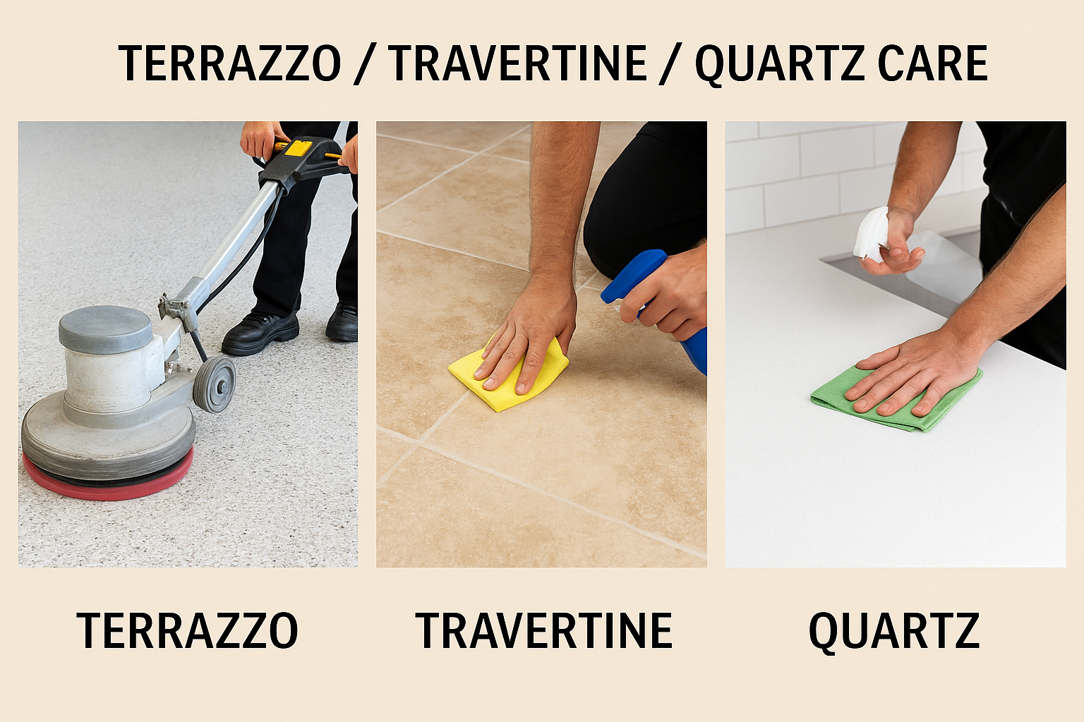 Specialized processes for terrazzo, travertine, and quartz surfaces — including deep cleaning, repair, refinement, and sealing. We restore natural clarity and color while improving long-term cleanability and resistance to stains.